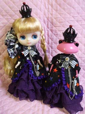 まずは、ワンダやミディブライス対応サイズの、夜会ドレス紫バージョンです。星をイメージしてまして、落ち着いた感じのドレスとなりました。…本当はニッキにも着用出来るように作ったつもりだったんですが…肩幅が微妙に合わずに着せることが出来なかったため(泣)、あくまでも対応サイズはワンダとミディブライスという風にさせていただきました。なお、頭に乗っけてる王冠は参考品ということで、セット内容には含まれておりませんのでご了承くださいませ。